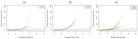 P-values QQ-plot of genome-wide ACPA-methylation associations. (a): 1,305,080 CpGs with good coverage in Dataset 1. (b): 4,259,820 CpGs with good coverage in Dataset 2. (c): 1,095,002 CpGs with good coverage in both datasets.