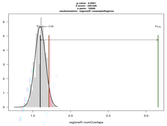 - Gel, B.; Díez-Villanueva, A.; Serra, E.; Buschbeck, M.; Peinado, M.A.; Malinverni, R. regioneR: An R/Bioconductor package for the association analysis of genomic regions based on permutation tests. Bioinformatics 2016, 32, 289–291. [Google Scholar] [CrossRef] [PubMed]