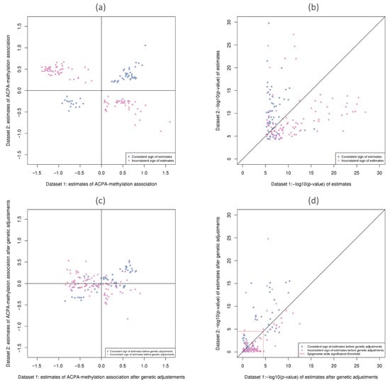 Scatter plots illustrating agreement between results for the 157 CpGs identified as demonstrating ACPA-methylation associations in both Dataset 1 and Dataset 2. (a) Estimated model coefficients (log odds ratios) from the EWAS binomial regressions. Points are colored in blue if the coefficient signs agree, and in pink otherwise; (b) (p-values) from EWAS binomial regressions; (c) estimated coefficients (log odds ratios) after genetic adjustments; (d) (p-values) after genetic adjustments including lines indicating significance threshold (). Shapes and colors for points in (b–d) correspond to those assigned in panel (a) for intuitive tracking of their changes.