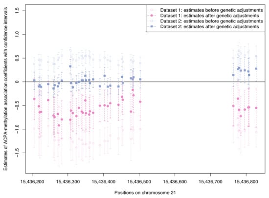 In order to better visualize how ACPA-methylation associations may be influenced by genetic variation, Figure 5 shows the log odds ratio estimates of association with ACPA status, and their confidence intervals, for two adjacent DMRs on chromosome 21 that were well captured in both datasets. The estimates obtained from both datasets are shown, before and after including cis-SNP variables into the models. When no SNPs were included as covariates, the sign of coefficients for ACPA disagreed between Dataset 1 and 2, but both met our threshold for statistical significance. That is, the DMCs showed significantly higher methylation levels among the ACPA-positive individuals in Dataset 2, but significantly lower methylation levels in Dataset 1. However, after accounting for the genetic effects from 5 SNPs (selected from 1438 potential meQTLs by adaptive lasso), the results of two datasets became less divergent, and the coefficient estimates became closer to zero. Most of the positive associations in Dataset 2 lost strength after adjusting for genetic effects, but in Dataset 1 they remained statistically significant below zero.