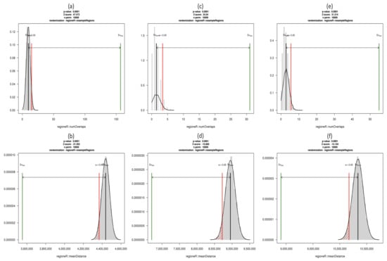 Null distributions and corresponding 0.05 p-value thresholds for overlap or agreement, from 10,000 permutations in different cases: (a) the number of overlapping ACPA-associated DMCs between two datasets; (b) the mean distance between ACPA-associated DMCs in two datasets; (c) the number of overlapping ACPA-associated gDMCs between two datasets; (d) the mean distance between ACPA-associated gDMCs in two datasets; (e) the number of overlapping RA-associated DMCs between two datasets; (f) the mean distance between RA-associated DMCs in two datasets. The X-axis represents the number of overlapping sites in (a,c,e) and the mean distance in (b,d,f), the Y-axis specifies the density so that the histogram has a total area of one. The green vertical bars represent what we actually observed in each case. The sampling universe for permutations was CpGs tested in both datasets.
