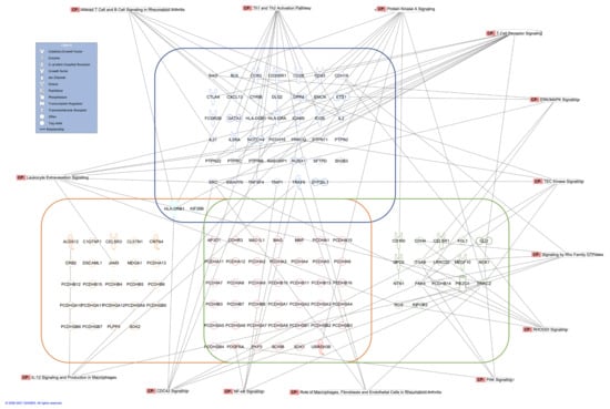 In order to gain a more systematic understanding of how cell–cell adhesion may play a role in RA pathogenesis, and how the differentially methylated genes and SNP-associated genes involved in cell–cell adhesion may communicate, the three groups of genes in Table 7 were overlaid with the curated canonical pathways from the database of QIAGEN Ingenuity Pathway Analysis (IPA) software. In Figure 8, the three groups of cell–cell adhesion genes are surrounded by different boxes, and the genes shared across groups are placed in the intersection areas. Several top signaling pathways related to immunoreaction, such as NF-B signaling, Th1 and Th2 activation, leukocyte extravasation signaling and pathways of migration-related proteins, such as Rho family of GTPases, are highlighted around the genes.