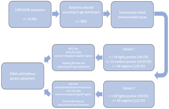 The CARTaGENE cohort [] is a sample of approximately 40,000 individuals from four regions in Quebec, Canada, with demographic and health questionnaires as well as stored blood, serum and urine samples. Stored serum samples from 3600 participants among the first 19,995 recruited subjects were analyzed for ACPA levels with INOVA enzyme-linked immunosorbent assay (Quanta Lyte, CCP3 IgG: Inova Diagnostics Inc., San Diego, CA, USA) []. From these results, Shao et al. (2019) had selected 137 subjects with either high ACPA (optical density of ACPA > 20) or low ACPA (optical density of ACPA ≤ 20) levels to undergo custom methylC-capture sequencing (MCC-Seq) []. Here in this replication study, 120 additional individuals were selected with either highly positive (optical density of ACPA > 60) or negative (optical density of ACPA ≤ 20) ACPA levels, and their stored blood samples were sent for MCC-Seq. Blood cell composition and genotype information of the sequenced samples were measured or collected from different pipelines during sequencing. Figure 9 provides an overview of the data collection process in the initial and this replication study.