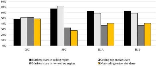 Share or markers in coding and non-coding regions in relation to the size share of coding and non-coding elements in main genome regions: LSC—large single copy region, SSC—small single copy region, IR-A/IR-B—inverted repeat regions A and B.