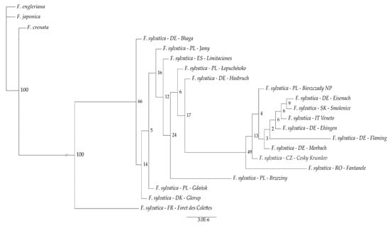 Phylogenetic relationships among 18 F. sylvatica individuals, as inferred using Maximum Likelihood, with F. crenata, F. japonica, and F. engleriana as outgroup. Numbers on nodes indicate percentages of bootstrap support from 1000 bootstrap replicates, the genetic distance between the F.sylvatica individuals and the outgroup was shorten by 0.04.