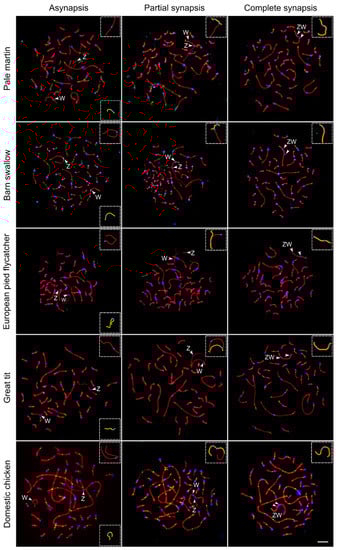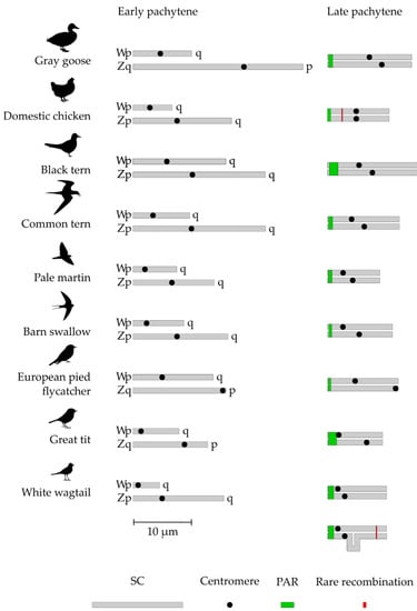 - Pigozzi, M.I. The chromosomes of birds during meiosis. Cytogenet. Genome Res. 2016, 150, 128–138. [Google Scholar] [CrossRef] [PubMed]
