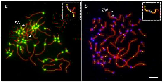 - Solari, A.J.; Pigozzi, M.I. Recombination nodules and axial equalization in the ZW pairs of the Peking duck and the guinea fowl. Cytogenet Cell Genet 1993, 64, 268–272. [Google Scholar] [CrossRef]