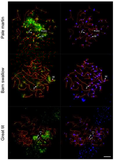 3.3. FISH of Whole-Chromosome Probe of the Pale Martin GRC with Pachytene Chromosomes of Three Songbird Species