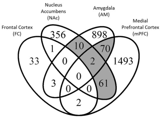 Figure 1 displays the overlap between DEGs across the four datasets. Individual gene results for each dataset are detailed in Supplementary Table S1. There is relatively little overlap between the datasets with no genes differentially expressed in all four datasets and just two genes that were common to three datasets. These were cellular retinoic acid binding protein 1 (Crabp1) and dopamine receptor D3 (Drd3) and only Crabp1’s change in expression was in the same direction for all three studies where it was downregulated in treated animals compared to controls. The D3 dopamine receptor plays a role in clinical antipsychotic response []. Crabp1 encodes a protein that binds retinoic acid, which is involved in the differentiation of neurons [,,]. Of the 149 genes common to two or more datasets, most were shared between AM and mPFC (n = 72), NA and mPFC (n = 63), and AM and NAc (n = 12).