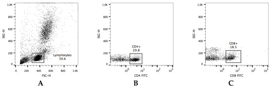Peripheral blood mononuclear cells (PBMCs) were isolated from 10 mL of whole blood, and the samples were diluted at a ratio of 1:2 with phosphate-buffered saline (PBS; Lonza) containing 2% fetal bovine serum (FBS; Gibco, Thermo Fisher Scientific, Inc., Waltham, MA, USA), overlaid on Lymphoprep (Stemcell Technologies Inc., Vancouver, BC, Canada), and centrifuged at 800× g for 30 min. The PBMC layer was removed and transferred into ammonium-chloride-potassium (ACK) lysing buffer (Gibco) for the lysis of red blood cells. PBMCs were washed twice with RPMI-1640 medium (FBS 10%, penicillin 100 IU/mL and streptomycin 0.1 mg/mL, Gibco), the cells were adjusted to 1 × 106 cells/mL with PBS and separated into 9 light-protected 1.5 mL microcentrifuge tubes, each containing 1 × 105 cells/mL. The tubes were centrifuged, the supernatant was discarded, and the pellet was resuspended with 2% bovine serum albumin (BSA) in PBS. The cells were incubated for 30 min at 4 °C with mAb against surface molecules (see below). After staining, the cells were washed twice with 1mL of PBS and fixed with 4% paraformaldehyde for 30 min at 4 °C. Lastly, the cells were resuspended with 1% BSA/PBS and stored at 4 °C for later testing with an EPICS® XL-MCL flow cytometer (Beckman Coulter). The flow cytometry gates were set on singlets, following lymphocytes and live cells (SSC-H and FSC-H). All gating strategies for immune cells are shown in Figure 2.
