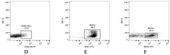 Gating strategy for flow cytometry data. Representative dot plots illustrating the gated (A) lymphocytes population within leukocytes. The gating strategy for the evaluation of lymphocyte subpopulations—(B) CD4+, (C) CD8+, (D) CD80/86+, (E) MHCI+, (F) MHCII+. The frequency of cells is expressed as a percentage of positive cells in a lymphocyte gate.
