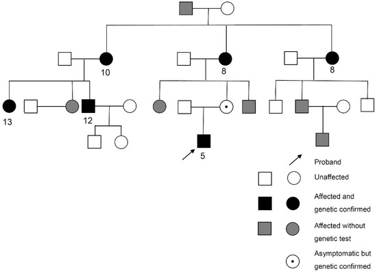 Pedigree and age of onset in each patient of Proband No. 12 family. Arrow: Proband No. 12.
