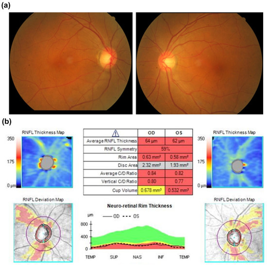 (a) Fundoscopic exam initially showed pinkish optic disc at disease onset. (b) Optical coherence tomography revealed a remarkably decreased retinal nerve fiber layer of both eyes six months after disease onset.