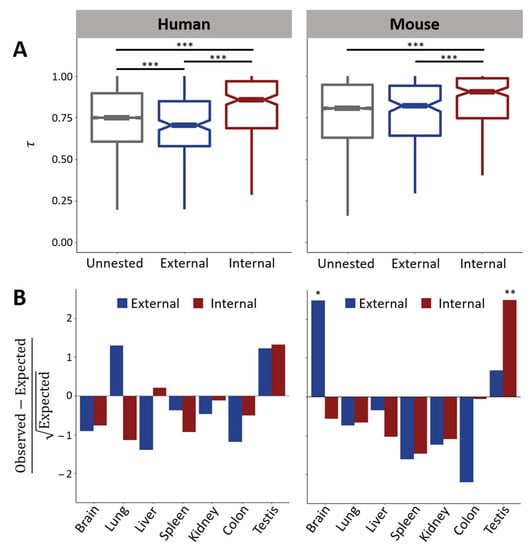 Expression breadths of external and internal protein-coding genes. (A) Distributions of tissue specificities (τ) across seven tissues in human (left) and mouse (right) unnested, external, and internal genes. Higher τ corresponds to greater tissue specificity. (B) Hanging chi-grams comparing observed numbers of human (left) and mouse (right) primary tissues of tissue-specific external and internal genes to expectations based on those of unnested genes. Positive and negative values indicate over-representations and under-representations, respectively. * p < 0.05, ** p < 0.01, and *** p < 0.001 (after Bonferroni corrections for Figure 1B; see Materials and Methods for details).