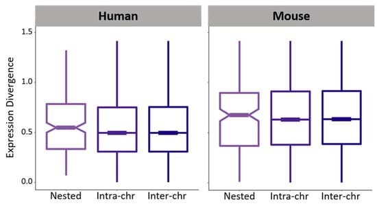 Tables of normalized strand-specific RNA-seq abundances in transcripts per million (TPM) from brain, lung, liver, spleen, kidney, colon, and testis tissues in human (E-MTAB-4344) [] and mouse (E-MTAB-2801) [] were downloaded from Expression Atlas [] at https://www.ebi.ac.uk/gxa/home/ (accessed on 23 August 2021). All data in Expression Atlas are obtained with the iRAP pipeline, averaged across technical replicates, and quantile normalized []. Though there are numerous gene expression data sets available for human and mouse, I chose these specifically because they contain seven of the same tissues and were obtained from strand-specific RNA-seq experiments, which enable more accurate expression quantification of overlapping genes []. To minimize noise, all genes with TPM in at least one of the seven tissues were retained for expression analyses, yielding 269 human (Table S1) and 265 mouse (Table S2) nested genes for which both external and internal genes met this threshold. The requirement that both external and internal genes be expressed was used to ensure that findings from expression analyses involving one and both genes are comparable, and also that transcriptional interference between the genes is possible. I estimated the expression breadth of each gene by computing the tissue specificity index , which ranges from 0 (broadly expressed) to 1 (tissue specific []), and the expression divergence between each pair of genes by computing the Euclidian distance between their relative TPM across tissues, which enables inter-species comparisons [,].