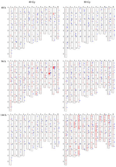 To study the dynamic differences in mutations between the two irradiation doses at different time points, we first calculated the mutation frequency in response to the two irradiation doses at different time points after germination. In general, regardless of whether 40 Gy or 80 Gy of CIB irradiation was applied, we observed an increase in mutation frequency from 48 to 96 h (Figure 1). However, the mutation frequency decreased in response to 40 Gy of CIB irradiation at 144 h after germination, whereas it tended to continuously increase in response to 80 Gy of CIB irradiation. Moreover, a high mutation frequency was found on chromosome 10 (Chr10) and chromosome 11 (Chr11) in response to 40 Gy of CIB irradiation at 96 h after germination (Figure 1), and their mutation frequencies were 0.8–2.2 times higher than the average level throughout the whole genome. We subsequently measured and visualized the distribution of mutations across the chromosomes. A total of 177 mutations were detected in the 5–6 Mb region of Chr11 and 86 and 54 mutations were detected in its adjacent regions (4–5 and 6–7 Mb). Although these mutations encompassed only a 10% region of Chr11, they constituted 87.09% of all the mutations of Chr11. By visualizing these variations, we identified these mutations as composing clustered DNA lesions caused by CIB irradiation. Notably, the mutation frequency was not proportional to the length of the chromosome for either dose of CIB irradiation. For example, Chr10 is relatively short, but its mutation frequency was higher than the average level across the whole genome.