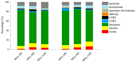 Regardless of whether 40 Gy or 80 Gy of CIB irradiation was applied, mutations were induced predominantly in intergenic regions (65.18–75.66%), followed by upstream and downstream regions (11.11–16.22%), intronic regions (6.04–10.25%), UTR3 and UTR5 (2.10–5.75%), and exonic regions (1.49–6.66%) (Figure 2). Generally, mutations induced in an exonic gene region may have a high impact on gene function. At 144 h after seed germination, 13 and 87 mutations were induced in the exonic region in response to 40 Gy and 80 Gy, respectively. At the initial stage (48 h post-irradiation), although 40 Gy of CIB irradiation induced more mutations than 80 Gy of CIB irradiation did, most occurred in the intergenic regions and were less frequent in the exonic regions (both of which had fewer than eight). However, with cell proliferation and DNA replication, 80 Gy of CIB irradiation induced exonic mutations 6.7 times more frequently than 40 Gy of CIB irradiation did. As a result, 80 Gy of CIB irradiation may have higher mutagenic efficiency than 40 Gy of CIB irradiation in practical breeding.