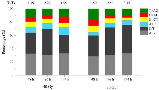 Among the mutations induced by CIB irradiation, SBSs were the most abundant and were induced by both 40 Gy and 80 Gy CIBs. We found that C:T and A:G transitions were the two major types of mutations induced in response to both doses of CIB irradiation, and their proportion (60.00–75.91%) was significantly higher than that of the other types of mutations (Figure 3). From 48 to 96 h, the proportion of C:T and A:G transitions obviously increased in response to both doses of CIB irradiation, while it decreased in response to 40 Gy and increased in response to 80 Gy from 96 to 144 h. At the initial stage (48 h), we identified 98 (32.78%) and 33 (28.70%) A:G transitions and 94 (31.44%) and 36 C:T (31.30%) transitions under the 40 Gy and 80 Gy CIB irradiation, respectively. However, at 144 h, the proportion of A:G transitions was similar for both doses of CIB irradiation, while the proportion of C:T transitions in the 80 Gy group was significantly higher than that in the 40 Gy group. As a result, the Ti/Tv ratio in response to 80 Gy of CIB irradiation was 2 times greater than that in response to 40 Gy of CIB irradiation at 144 h.