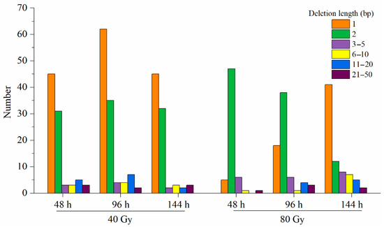 Among insertions, single-base ones were the most frequent in response to both doses (40 and 80 Gy) of CIB irradiation. The size of the insertions varied from 1 to 10 bp, but the majority were 1–5 bp (Figure 4). With respect to the number of insertions, there was no significant difference between the two doses of CIB irradiation, and the insertion sizes were similar. However, with respect to deletions, 40 Gy of CIB irradiation seemed to induce more deletions than 80 Gy CIB irradiation did. In addition, single-base deletions and 2 bp deletions were the most frequent in response to 40 and 80 Gy CIB irradiation, respectively. Overall, regardless of 40 or 80 Gy of CIB irradiation was applied, short InDels (<2 bp) were more frequent than long InDels were (Figure 5). Interestingly, at the initial stage (48 h), 40 Gy of CIB irradiation induced long InDels (>5 bp) more frequently than 80 Gy of CIB irradiation did, but at the later stage (144 h), we identified more long InDels (>5 bp) in response to 80 Gy of CIB irradiation than in response to 40 Gy of CIB irradiation.