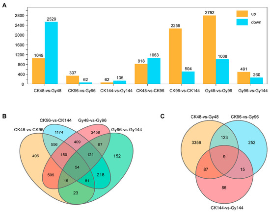 Analysis of differentially expressed genes (DEGs) between control group (CK) and irradiated samples (Gy). (A) The number of DEGs between control group (CK) and irradiated samples (Gy) at three time points after 40 Gy CIB. (B) Venn diagram of DEGs in the same treatment at different times. (C) Venn diagram of DEGs at three different times for the CK vs. Gy transcriptome comparison.si.