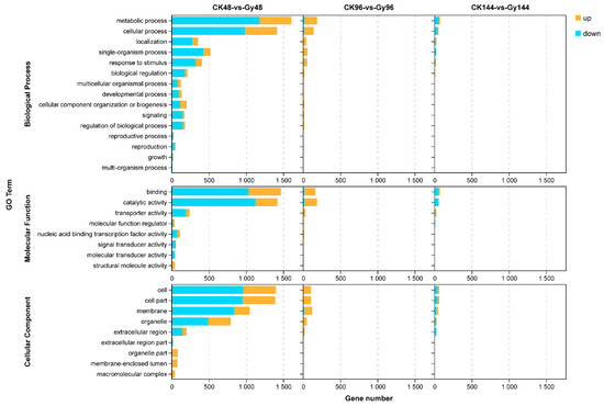 GO analysis of DEGs whose expression was up-and downregulated in the CK vs. Gy comparison. CK, control samples; Gy, samples treated with 40 Gy of CIB irradiation.