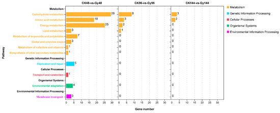 To further explore the biological functions of the DEGs, an enrichment analysis based on the content within the KEGG pathway database was performed. The top 12 KEGG pathways involving most DEGs are listed in Figure 8. At 48 h, the DEGs were enriched mostly in terms such as “carbohydrate metabolism”, “energy metabolism”, “amino acid metabolism”, “carbon metabolism”, “metabolism of terpenoids and polyketides”, and “replication and repair”, whereas at 96 and 144 h, the DEGs were enriched mostly in “carbohydrate metabolism” and “amino acid metabolism”. Of the three time points, only at 48 h were different enrichment pathways revealed, such as “metabolism of terpenoids and polyketides” and “replication and repair”.