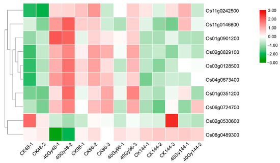Since a larger number of DEGs were identified at 48 h, many fewer DEGs were detected at 96 and 144 h. Additionally, KEGG enrichment analysis showed that the “replication and repair” pathway was significantly enriched only at 48 h. These results suggest that the expression of a number of DNA repair-related genes and pathways may be induced rapidly (48 h or earlier) in response to DNA damage. Therefore, we focused on the expression of genes related to DNA repair after exposure to CIB irradiation for 48 h. Of the known DNA repair-related genes in rice, ten genes involved in the DNA repair pathway increased in expression after exposure to CIB irradiation for 48 h (Table 3 and Figure 9). Among them, Os01g0901200, an orthologue of AT2G19490 in Arabidopsis, encodes a recA protein involved in recombination-dependent repair and plays an important role in the maintenance of organelle genome integrity [24,25]. The expression of Os01g0901200 was upregulated at 48 h after germination in response to 40 Gy of CIB irradiation. Two DSB repair-related genes, Os01g0351200 and Os02g0829100, which are orthologues of PARP2 (AT4G02390) and PARP3 (AT5G22470), respectively, in Arabidopsis were detected as genes whose upregulated expression depended on CIB irradiation in this study. Previous studies have shown that PARP family genes not only are involved in Ku-independent non-homologous end-joining (NHEJ) (alternative (A)-NHEJ) in animals but also play a role in the A-NHEJ pathway in plants [26,27]. Additionally, another gene, Os04g0673400, whose expression was upregulated encodes a uracil-DNA glycosylase, and its Arabidopsis homologous gene AT3G18630 has been reported to be involved in a base-excision DNA repair pathway in mitochondria [28,29,30]. Os06g0724700 is also a gene whose expression was upregulated at 48 h after germination in response to 40 Gy of CIB irradiation; this gene encodes a phosphatidylinositol kinase and FAT domain-containing protein, and its Arabidopsis homologous gene AT5G40820 encodes an Arabidopsis orthologue of the ATR protein kinase that is both involved in a wide range of responses to DNA damage and plays a central role in cell cycle regulation [31,32].