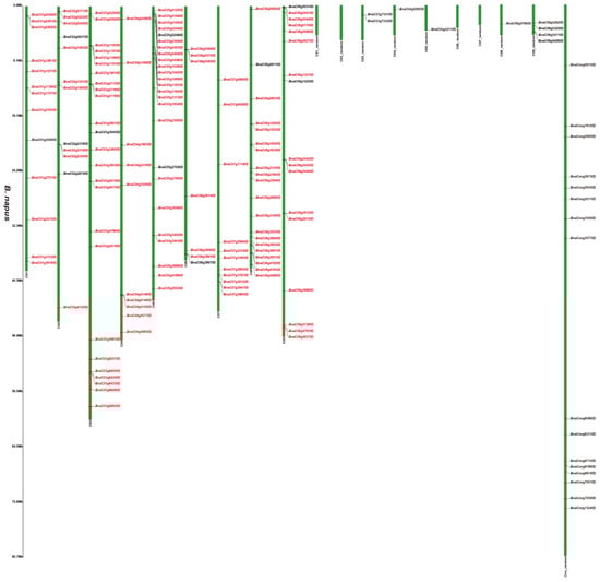 Chromosomal distribution of putative 2OGDs in B. napus. Individual 2OGD positions are shown in Mbs along the chromosome scale. The red label represents the homologous gene.