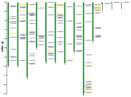 Chromosomal distribution of putative 2OGDs in B. rapa. Individual 2OGD positions are shown in Mbs along the chromosome scale. The blue label represents the retained gene, the yellow label represents the lost gene.