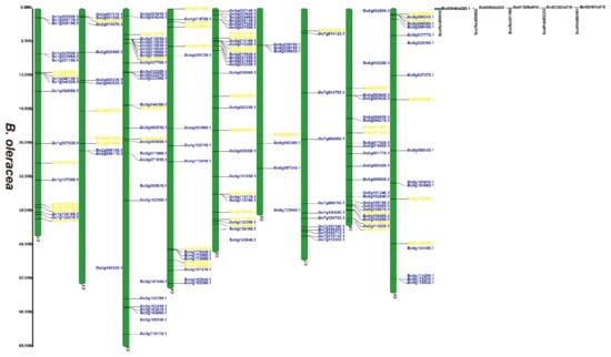 Chromosomal distribution of putative 2OGDs in B. oleracea. Individual 2OGD positions are shown in Mbs along the chromosome scale. The blue label represents the retained gene, the yellow label represents the lost gene.