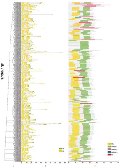 The A. thaliana 2OGD sequences were from a known reference [1]. The A. thaliana 2OGD protein sequences were downloaded from the NCBI database (http://www.ncbi.nlm.nih.gov/protein/, accessed on 1 January 2018). A total of 130 A. thaliana 2OGD protein sequences were used as queries in BLASTp searches with the Genome database, including B. napus, B. rapa, and B. oleracea, using a cut-off e-value of 1.0 × 10−10. The same gene IDs were removed, and the sequences with lengths less than 400 bp were discarded. The 130 available At2OGD sequence data are listed in Supplementary Table S1a. The retrieved sequences were then automatically checked for the DIOX_N and 2OG-FeII_Oxy superfamily domain in the Pfam server (http://pfam.xfam.org/search#tabview=tab1, accessed on 1 January 2018) or SMART server (http://smart.embl-heidelberg.de/, accessed on 1 January 2018). The proteins lacking complete DIOX_N or 2OG-FeII_Oxy domains were then discarded.