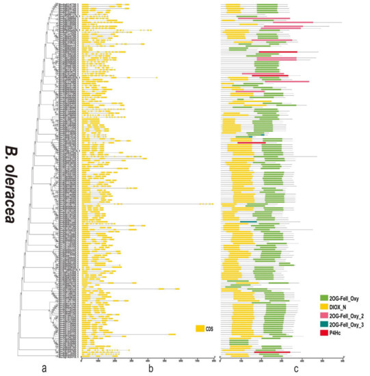 Phylogenetic relationships, gene structure, and domains in the 2OGD genes from B. oleracea. (a) The phylogenetic tree was constructed based on the full-length protein sequences of 2OGDs using MEGA-X software. (b) Exon-intron structure of the 2OGD genes. Green boxes indicate untranslated 5′- and 3′- regions; yellow boxes indicate exons; and black lines indicate introns. (c) The domain composition of the 2OGD proteins. The domains DIOX_N and 2OG-FeII_Oxy. Some genes that only have 2OG-FeII_Oxy_2, 2OG-FeII_Oxy_3, or P4Hc are displayed in different coloured boxes. The length of proteins can be estimated using the scale at the bottom.