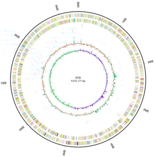 The genome of Corallococcus sp. strain EGB was sequenced using a hybrid strategy that combined sequences from PacBio long reads and Illumina short reads. The genome was assembled as a single circular chromosome of 9.4 Mb with a high GC content of 70.4% (Figure 1; Table 1). In contrast to the genomes of 11 reported Corallococcus species, only C. coralloides strain DSM 2259 had a chromosome level genome that was similar to strain EGB, while the remaining 10 Corallococcus species only had draft genomes containing from 8 to 1491 contigs in each genome (Table 1), suggesting that strain EGB had a high-quality genome in genus Corallococcus. Subsequently, RAST-based annotation identified 7916 coding genes in the strain EGB genome, and 61.5% of the proteins were functionally annotated, while the remaining 38.5% of the proteins were hypothetical proteins. The nonrepetitive gene density in the strain EGB genome was 842 genes/Mb with an average gene length of 1082 bp. By contrast, the genome size and gene number of strain EGB were slightly smaller than the majority of other Corallococcus genomes (Table 1).