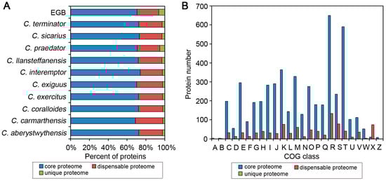 Comparative analysis of proteins between strain EGB and other Corallococcus species. (A) Number of protein families shared by different species. (B) Proportion of proteins enriched in the clusters of orthologous groups (COG) categories in the core, dispensable, and unique proteome. A, RNA processing and modification; B, chromatin structure and dynamics; C, energy production and conversion; D, cell-cycle control, cell division, chromosome partitioning; E, amino acid transport and metabolism; F, nucleotide transport and metabolism; G, carbohydrate transport and metabolism; H, coenzyme transport and metabolism; I, lipid transport and metabolism; J, translation, ribosomal structure and biogenesis; K, transcription; L, replication, recombination and repair; M, cell-wall/membrane/envelope biogenesis; N, cell motility; O, posttranslational modification, protein turnover, chaperones; P, inorganic ion transport and metabolism; Q, secondary metabolites biosynthesis, transport and catabolism; R, general function prediction only; S, function unknown; T, signal transduction mechanisms; U, intracellular trafficking, secretion, and vesicular transport; V, defense mechanisms; W, extracellular structures; X, mobilome: prophages, transposons; Z, cytoskeleton.