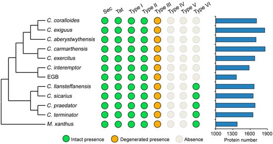 Protein secretion has not been well-studied in the Corallococcus genus. To explore the genomic potential in strain EGB for extracellular functions, the genome-wide identification of protein secretion systems was undertaken. The Sec and twin-arginine translocation (Tat) pathways are the most commonly used secretion systems for bacteria to transport unfolded and folded proteins across the cytoplasmic membrane [30]. In the Sec system, strain EGB contained all the key proteins except the chaperone SecB, which was dispensable (Supplementary Table S2). The Tat pathway consisted of three components: TatA, TatB, and TatC, and all of them were present in the strain EGB genome. Additionally, many other proteins are secreted through secretion systems numbered Type I through Type VI, with each system transporting specific proteins [31]. Genome mining showed that the primary proteins constituting the intact Type I and Type II secretion systems existed in the strain EGB genome (Figure 4, Supplementary Table S2). We also found two degenerated gene clusters encoding the Type III secretion system in the strain EGB (Supplementary Table S2), which was similar to that in M. xanthus. In contrast, the majority of proteins making up Type IV, Type V, and Type VI secretion systems were lost in strain EGB (Figure 4). An investigation of other Corallococcus genomes revealed that their distributions of the above secretion systems were consistent with strain EGB, except for the Type VI secretion system, which was present in C. llansteffanensis, C. sicarius, C. praedator, and C. terminator, whereas it was absent in the remaining Corallococcus species. A SignalP analysis showed that strain EGB possessed 1361 proteins for secretion via the Sec pathway, while 93 proteins were secreted by the Tat pathway (Figure 4, Supplementary Table S3). In contrast, other Corallococcus species contained more secreted proteins. These results suggested that strain EGB may utilize distinct secretion systems for protein transport compared to other Gram-negative bacteria.