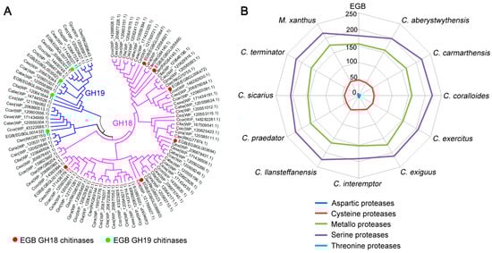 Comparison of chitinases and proteases. (A) Phylogenetic tree of chitinases derived from strain EGB, C. coralloides, C. praedator, and M. xanthus. (B) Comparison of protease numbers among Corallococcus species.