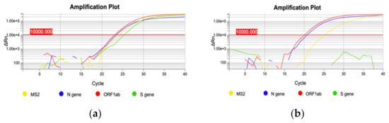 Two representative qRT-PCR amplification plots. (a) amplification of three targets: N gene, ORF1ab gene and S gene (blue, red and green curve, respectively); (b) S gene deletion: only N gene and ORF1ab gene targets are amplified (blue and red curve, respectively).