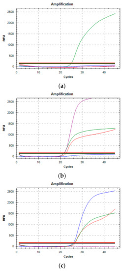 Three typical amplification results of Variants qRT-PCR. (a) The presence of only one green amplification curve indicates that wild type (WT) sequences of SARS-CoV-2 have been amplified. (b) Purple, red, and green curves occurring simultaneously (69-70del, N501Y mutated and E484K WT, respectively) determine for the B.1.1.7 variant. (c) Blue, red and green curves (E484K mutated, N501Y mutated and 69-70del WT, respectively) detect the B.1.351 or P.1 variant.
