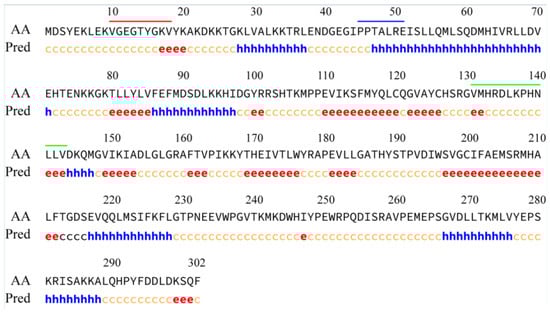 Structures and conserved domains of the LaCDKB1;2 protein. e: α-helixes; h: β-strands (extended strands); c: random coils. Red line: ATP-binding region signature [V(10)GEGTYGKV(18)]; blue line: PPTALRE motif; green line: serine/threonine protein kinase acting-site signature [V(131)MHRDLKPHNLLV(143)]. AA: amino-acid sequence; Pred: prediction of secondary structures.