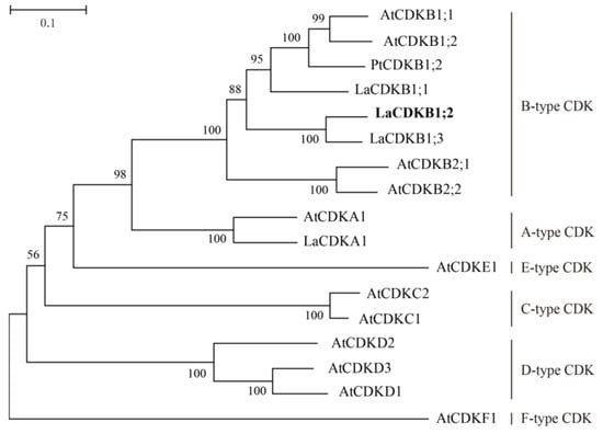 A phylogenetic tree was constructed with 17 proteins—four LaCDKs (L. kaempferi), one PtCDK (P. trichocarpa), and 12 AtCDKs (A. thaliana). LaCDKB1;2 clustered into the B-type CDK family and showed high similarity with other CDKBs, and they clustered together (Figure 2).
