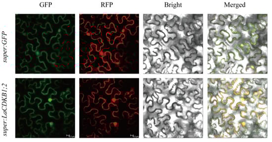 The full-length coding sequence of LaCDKB1;2, carrying Spe I and Kpn I restriction sites, was fused in-frame to a super1300-GFP vector [27]. The recombinant plasmid super1300-LaCDKB1;2-GFP was transformed into an Agrobacterium tumefaciens strain, GV3101, while super1300-GFP was used as a control. AtPYR1, which is a red fluorescent protein (RFP)-tagged marker that is located in epidermal cells and nuclei [28], was used as a positive marker. The bacterial strains were cultured in liquid Luria-Bertani medium on a shaker at 250 rpm and ~28 °C for 16 h. Then, they were collected by centrifugation, and the pellets were placed in a re-suspension solution with 10 mM MgCl2, 10 mM 2-(N-morpholino) ethanesulfonic acid hydrate buffer (pH 5.6), and 200 µM acetosyringone. After incubation for 2–3 h at room temperature, the bacterial re-suspension was infiltrated into the leaves of 3-week-old Nicotiana benthamiana. After 72 h, the infiltrated leaves were harvested, cut into small squares, and stained in a working solution with 137 mM NaCl, 10 mM Na2HPO4, 2.7 mM KCl, and 2 mM KH2PO4. Fluorescence was observed under a confocal laser scanning microscope (Zeiss LSM 510 META, Oberkochen, Germany).