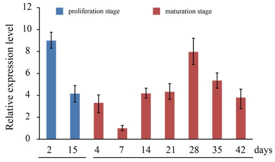 Expression pattern of LaCDKB1;2 during L. kaempferi somatic embryogenesis. Culture line S287, grown in a proliferation medium for 2 or 15 days and in a maturation medium for 4, 7, 14, 21, 28, 35, or 42 days, was harvested for qRT-PCR, with LaEF1A1 used as the internal control. Data are presented as the mean ± SE.