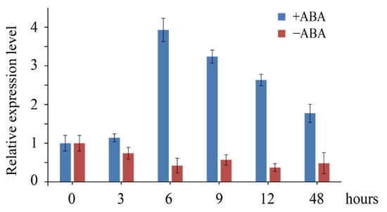 We further investigated the response of LaCDKB1;2 to ABA. After the treatment of cultures with 75 µM ABA, LaCDKB1;2 expression increased at 6 h (p ≤ 0.05) and then decreased (p ≤ 0.05) (Figure 5), while there was no change in LaCDKB1;2 expression in cultures without ABA treatment (p ≥ 0.05). These results indicate that ABA indeed regulates LaCDKB1;2 expression during L. kaempferi somatic embryogenesis.