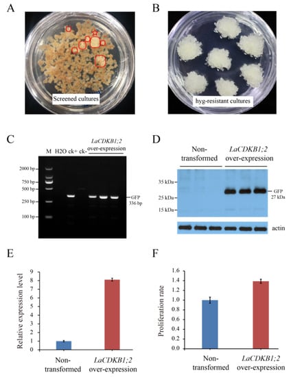 To reveal the function of LaCDKB1;2 in somatic embryogenesis, Agrobacterium-medicated transformation was performed using the super:LaCDKB1;2 plasmid. Several clumps of cultures were produced in a solid proliferation medium with 400 mg/L cefotaxime and 5 mg/L hygromycin and classified as hygromycin-resistant cultures (Figure 7A). The hygromycin-resistant cultures were then cultured in a solid proliferation medium with 5 mg/L hygromycin, where one clump of cultures survived and was proliferated and used for PCR and Western blot analysis (Figure 7B). The results showed that the fusion protein GFP was only detected in the transgenic cultures (Figure 7C,D). The proliferation rate of cultures and the morphology of cotyledonary embryos were analyzed after LaCDKB1;2 over-expression. Compared with non-transformed cultures, LaCDKB1;2 expression increased in the transgenic cultures (p ≤ 0.05) (Figure 7E), and the proliferation rate of the transgenic cultures increased by 38% (p ≤ 0.05) (Figure 7F). These data indicated that the increased proliferation rate of cultures might have resulted from enhanced cell division activity after LaCDKB1;2 over-expression.