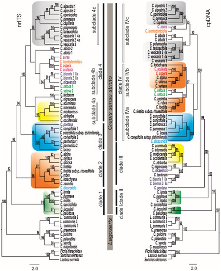 Phylogenetic relationships among the analysed Crepis species based on the nrITS and the cpDNA data sets. Bootstrap support values are indicated at each node. Names of the species that were recovered in different positions in the two datasets are indicated in colour. The trees were rooted with Picris hieracioides, Lactuca serriola, and Sonchus oleraceus.