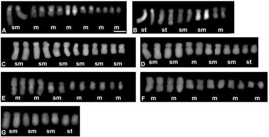 Karyograms representing each of the karyotype formula distinguished among the analysed Crepis species: (A) Lapsana communis; (B) C. magellensis; (C) C. jacquinni; (D) C. paludosa; (E) C. succisifolia; (F) C. lyrate; (G) C. nicaeensis. Letters below each pair of chromosomes indicate the type of chromosome: m—metacentric; sm—submetacentric; and st—subtelocentric. The metaphase plates used to prepare the karyograms are presented in Figure S2. Scale bar = 5 µm.