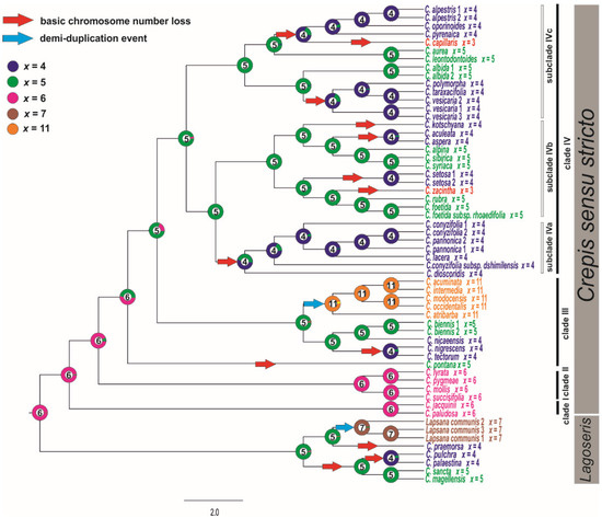 Molecular phylogenetic studies of the genus Crepis sensu lato (s.l.) tested Babcock’s hypothesis in a phylogenetic framework [22] and proposed a new classification of this genus. Three evolutionary lineages were distinguished based on the analyses of 75 taxa: (i) species with a chromosome base number x = 7, corresponding to Babcock’s section Ixeridopsis and now placed in genus Askellia; (ii) Babcock’s sections Intybellia, Lagoseris, Phaecasium, Microcephalum, and Pterotheca, as well as two other genera, Lapsana and Rhagadiolus, now included in the Lagoseris evolutionary lineage; and (iii) Crepis sensu stricto (Crepis s.s.), which comprised the remaining analysed Crepis species [22,23]. The new sections were highly heterogeneous compared to Babcock’s sections, also concerning base chromosome numbers, suggesting that the infrageneric classification of Babcock did not represent natural groups [20,22,23].