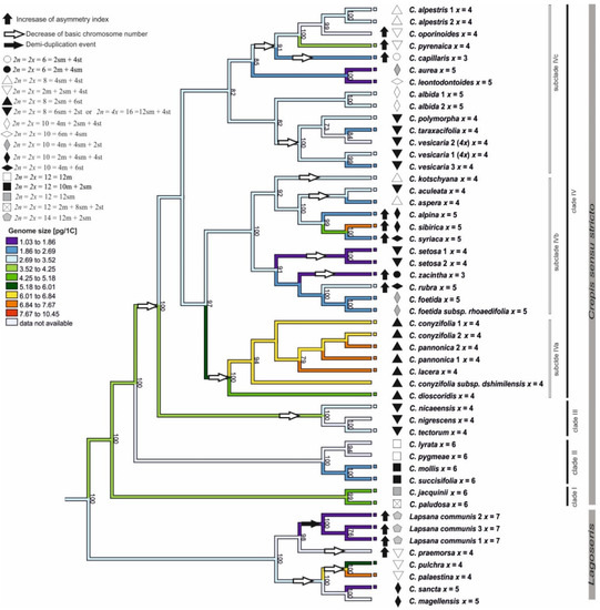 - Dimitrova, D.; Greilhuber, J. Karyotype and DNA-content evolution in ten species of Crepis (Asteraceae) distributed in Bulgaria. Bot. J. Linn. Soc. 2000, 132, 281–297. [Google Scholar] [CrossRef][Green Version]