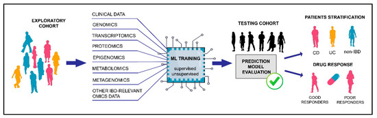Machine learning using omics data for prediction of clinically relevant IBD outcomes. Omics data from patients with known clinical outcomes (exploratory cohort) can be used as input data in machine learning algorithms during the prediction model training. Performance of the designed model is further assessed on an independent group with unknown outcomes (testing cohort). Machine learning models that have high prediction performance on the testing cohort are well fitted and could be employed for future improved patients’ diagnosis, classification, prognosis and prediction of drug response. ML—machine learning, CD—Crohn’s disease, UC—ulcerative colitis, and IBD—inflammatory bowel disease.