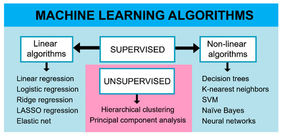 Unsupervised learning deals with unlabeled data, and the aim is to group instances according to similarity and to find structures within the data. This approach is particularly useful when multiple input variables are included because researchers are unable to visualize and find patterns in hyper-dimensional space. Also, these methodologies are also used for anomaly detection and dimensionality reduction. In life science and IBD research, unsupervised learning algorithms such as hierarchical clustering and the principal component analysis are commonly used [52,53] (Figure 2).